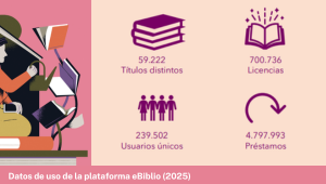 En 2025 eBiblio registró un incremento de todos los indicadores relacionados con la colección y el uso del servicio. Respecto a la primera, eBiblio puso a disposición de la ciudadanía un total de 59.222 títulos distintos y 700.736 licencias. Relativo a la segunda, el servicio fue utilizado por 239.502 usuarios únicos.