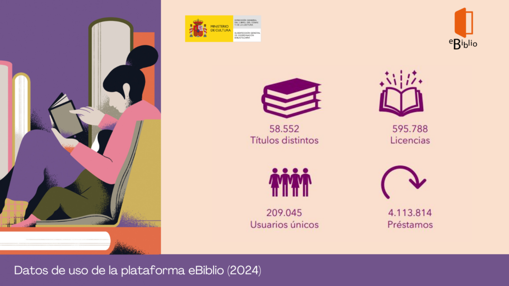 La Subdirección General de Coordinación Bibliotecaria del Ministerio de Cultura, en colaboración con las Comunidades Autónomas que participan en él, impulsa y coordina eBiblio. Recientemente, ha publicado los datos de uso de la plataforma, que ha visto incrementados en 2024 todos sus indicadores: el número de títulos ha aumentado un 14 %, las licencias disponibles un 6 %, los usuarios activos un 18 % y los préstamos realizados un 15 %.